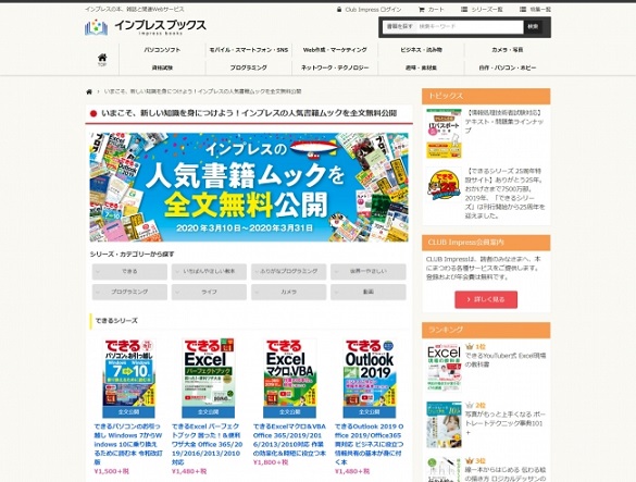 新型コロナウイルス感染症対策のため多くの児童生徒が自宅待機になっていることを受けて、出版社各社が雑誌・書籍を無料公開していますが、IT関連メディア事業を展開するインプレスも「できる」シリーズをはじめとする人気の書籍ムックの中から、家庭学習やPCスキルの獲得などに役立つ44タイトルを、Webサイト「インプレスブックス」にて期間限定で無料公開しています。