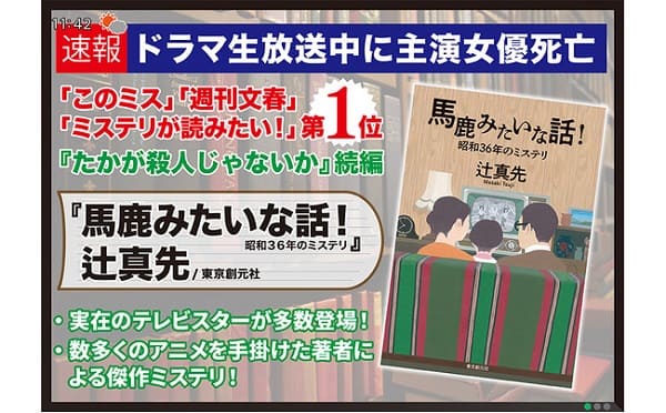 最新刊『馬鹿みたいな話!』の舞台は、お茶の間のメディアの中心がラジオだった昭和36年のCHK(中央放送協会。某公共放送がモデル)。密室ともいうべき、生放送中のテレビスタジオ内で主演女優が殺害されるという事件が発生。