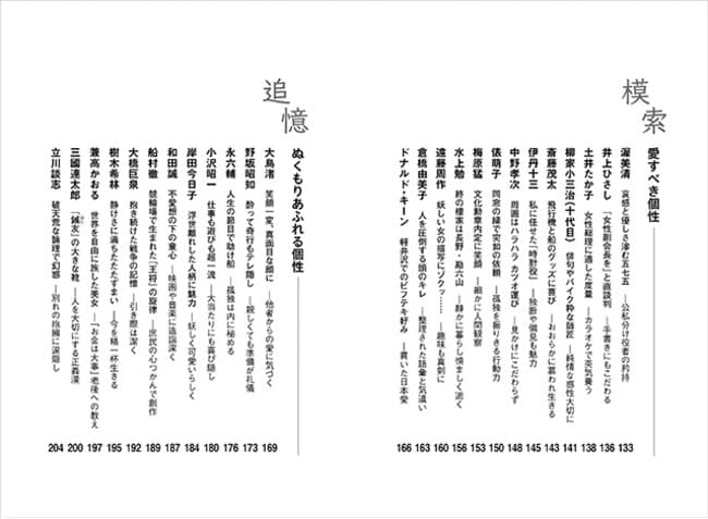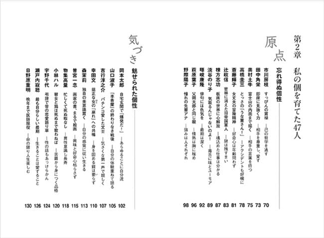 第2章「私の個を育てた47人」では、個性を確立して多彩な分野で活躍した47人との出会いや言葉、ときに別れを紹介し、自身の学びや気づきが語られます。