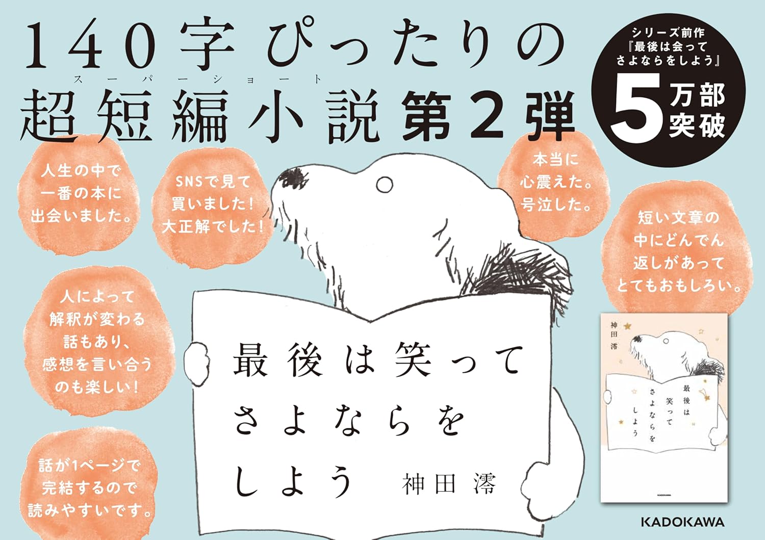 TikTokで人気爆発の『最後は会ってさよならをしよう』に続く、140字小説の名手・神田澪さんの超短編小説集『最後は笑ってさよならをしよう』がKADOKAWAより刊行されました。