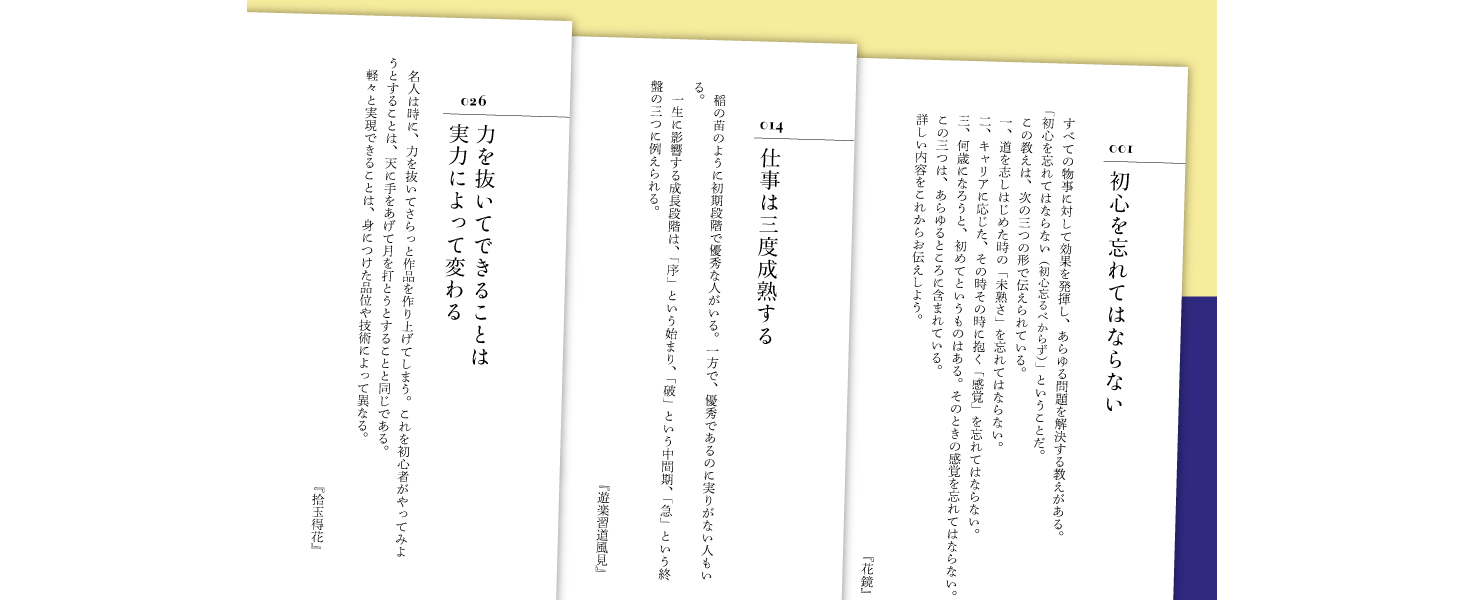 世阿弥の言葉は単なる心構えを述べるだけでなく、リーダーシップ、発想、目標達成、人材育成などの実践的な方法を説いており、ビジネスパーソンが仕事術としてすぐに使える要素がたくさん含まれています。以下に、いくつかの名言を紹介します。