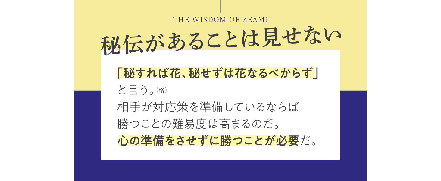 「秘すれば花、秘せずは花なるべからず」と言います。相手が対応策を準備しているならば、勝つことの難易度は高まります。心の準備をさせずに勝つことが必要です。
