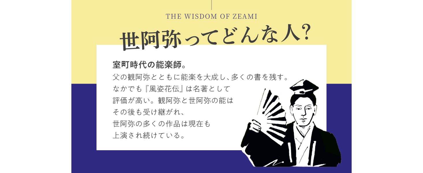 世阿弥は、室町時代の能楽師であり、父の観阿弥とともに能楽を大成し、多くの書を残しました。なかでも『風姿花伝』は名著として評価が高く、観阿弥と世阿弥の能はその後も受け継がれ、世阿弥の多くの作品は現在も上演され続けています。