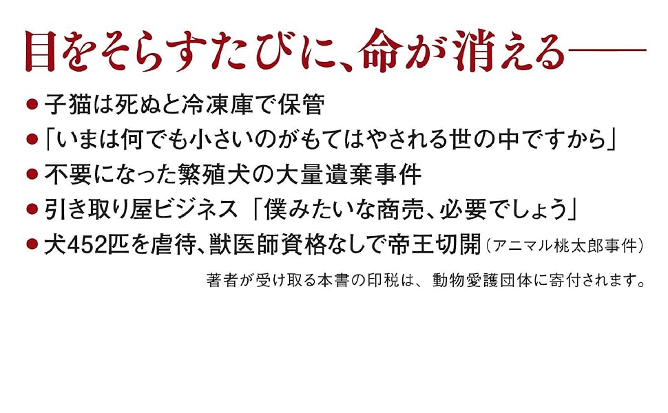 繁殖から小売りまでの流通過程では、毎年、少なくとも2万5千匹前後の命が失われています。人の都合で無理な繁殖、病を招く交配、幼くても出荷、「不良在庫」を引き取る闇商売……。「かわいい」の裏側で、ペットビジネスの「奴隷」となっている犬や猫たちがいる、この凄惨な実態を、丁寧な取材が暴きます。