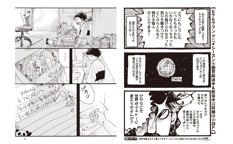 そんななか、両親が離婚して寂しさを抱える8歳の少年・みなぞうは、世界的に大ヒット中の漫画『モクモクマン』に夢中。彼がモクモクマンに送った手紙により、その作者・獅子王(ししお)との交流が始まる。獅子王もまた心に空虚さを抱えていて――。