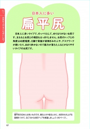日本人に多いタイプは「偏平尻」。のっぺりとして、めりはりがないお尻です。太ももとお尻の境目がはっきりしません。