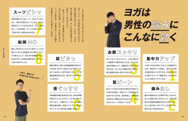 本書は、47歳の今でもスッキリと健康的なスタイルを保つヨガ愛好家、アンジャッシュの児嶋一哉さんを生徒に、ホットヨガスタジオLAVAの講師・加藤広大さん、山下真由実さんを監修者にそれぞれ迎えて、男性の体に合わせたポーズの取り方やコツ・その効果を紹介した初心者向けのヨガ入門書です。