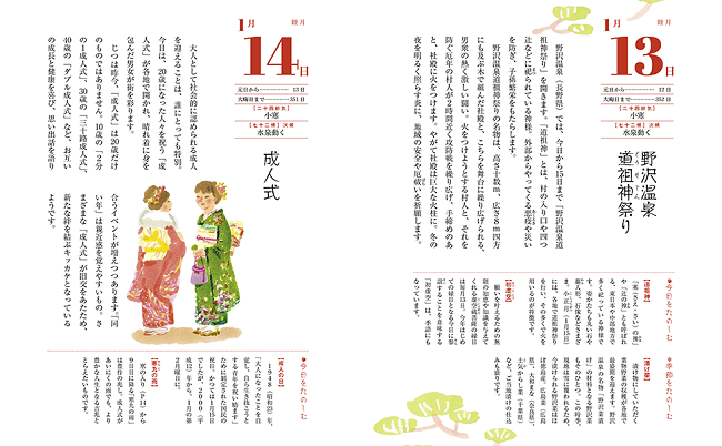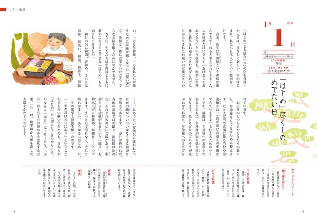 本書では、暦の知識はもちろん、「3月9日は3(さん)9(きゅー)でありがとうの日」「1月に食べたい旬の食材」など、暮らしの雑学が満載。この一冊で日本の年中行事やしきたりが学べます。おうち時間で、家族や大切な人と一緒に「今日はなんの日?」と予想しながら読めば、盛り上がること間違いなしです。