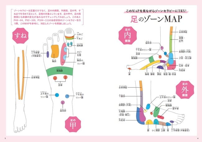本書では実際の足の症例をもとに、不調や未病の導き出し方を紹介。さらに、それらのお悩みに対応するゾーンセラピーも丁寧に解説しています。