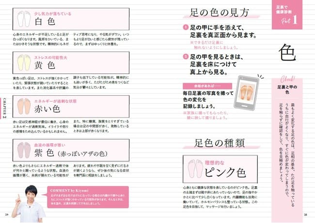 「足相診断」のコーナーでは、足裏のチェック法を詳しく解説。足の形や色、食感やしわ、角質のつき具合などあらゆる側面からチェックします。