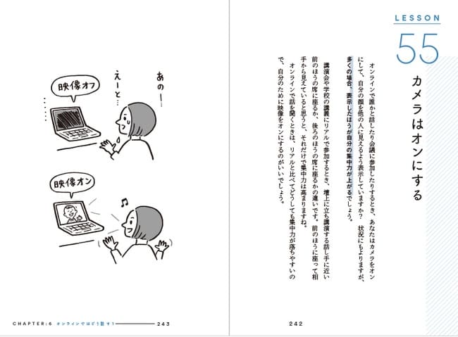 今回の改訂版では、オンラインでの会話術についてまとめた新章「Chapter 6 オンラインではどう話す?」を新たに加筆。オンラインでの会話ではどのようなことに気を付けるべきかについて、実践的なテクニックを紹介しています。