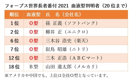 最新の日本、アメリカ、中国の大富豪について調査したところ、上位はO型が圧倒的でした。