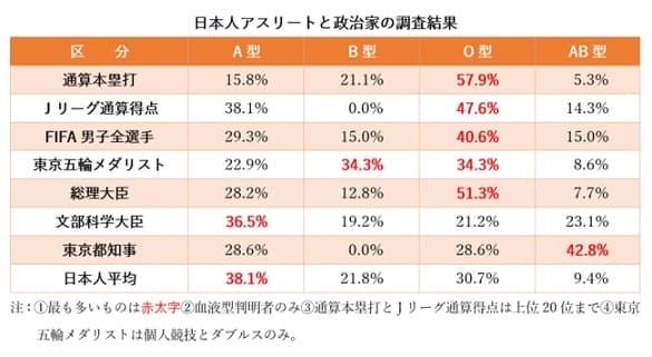 このほか、「歴史作家に多いA型」「男子フィギュアはB型ばかり」「血液型が同じ恋人はもたない」「時代で変わる将棋棋士 A型→B型→AB型→O型」などの興味深い傾向が見られています。