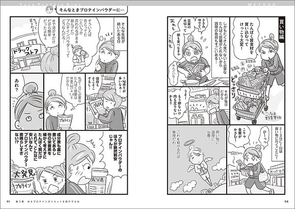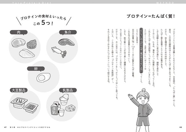 本書では、リバウンドを繰り返す泣き笑い必須のコミックエッセイをはじめ、「ゆるプロテインダイエット」のメソッドもイラストやマンガでわかりやすく解説しています。