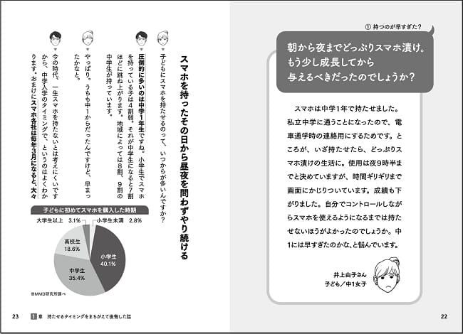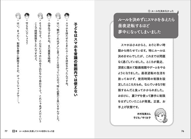 そこで本書では、石田さん流のスマホルール決めのノウハウを詳しく紹介しています。さらに、スマホを持たせるタイミングのアドバイスや、ゲームとの付き合い方、SNSトラブルの対処の仕方まで、子どもとスマホの関わりの中で起こりうるさまざまな親御さんの悩みにアドバイスしています。