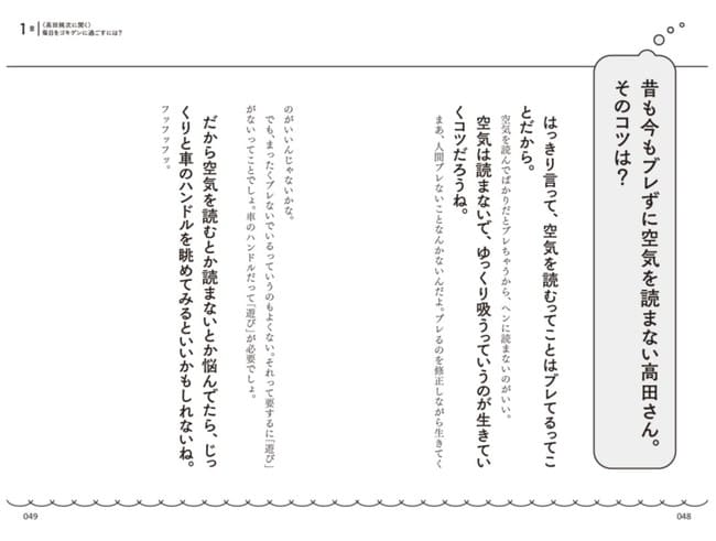 これでいいんです。あと、今も昔も裏表のないテキトーな高田さん。ずっとブレないコツを聞くと、「はっきり言って、空気を読むってことはブレてるってことだから。空気を読んでばかりだとブレちゃうから、変に読まないのがいい。空気は読まないで、ゆっくり吸うっていうのが生きていくコツだろうね」。