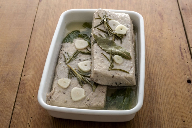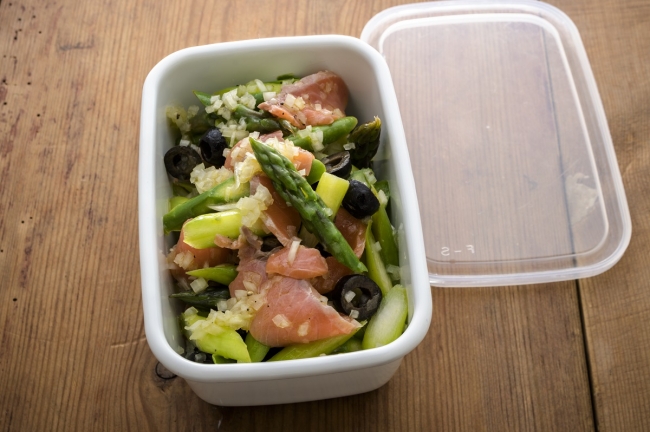 ▼「アスパラガスとサーモンのマリネ」は食べる時は自然解凍する
