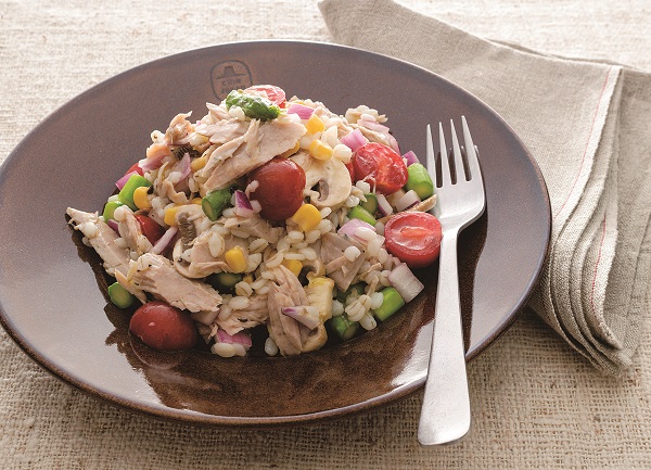 「自家製ノンオイルツナ」(上)があれば、押し麦と野菜で「押し麦のマリネサラダ」(下)が完成。