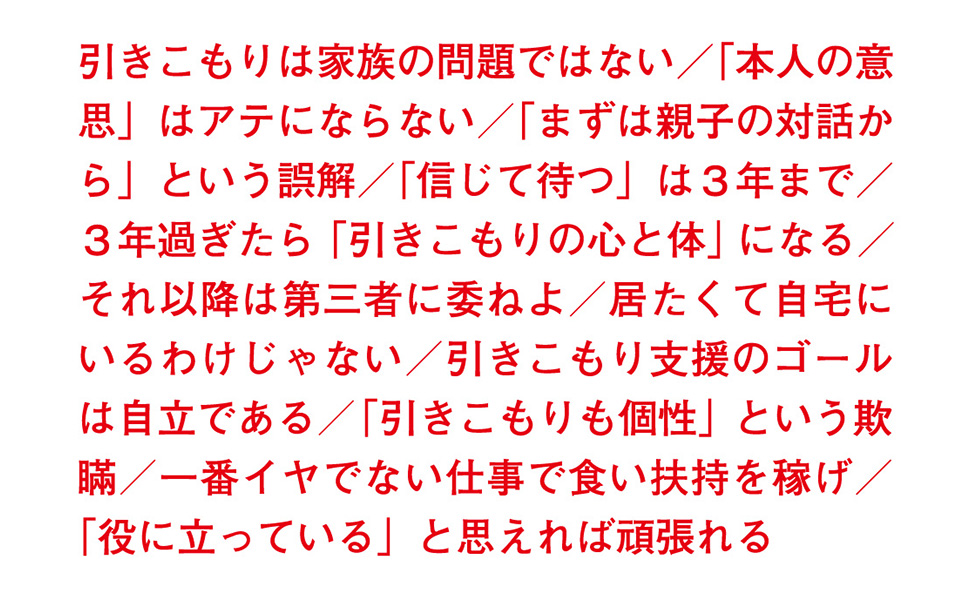 著者たちが創設した「認定NPO法人ニュースタート事務局」は、30年にわたって若者支援の活動をしています。「レンタルお姉さん」「レンタルお兄さん」という、引きこもり本人に直接働きかける訪問支援を展開すると共に、引きこもりの青年たちをあずかる寮も運営しています。こうした活動を通じ、病気など特別の事情がない限り、ほとんどの引きこもりは自立に至るといいます。本書は、彼らの支援ノウハウを一冊に結集したものです。