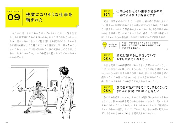 細かな状況によって使い分けられるように、1シチュエーションに2~3つのスマート言い訳を紹介。使い方の説明と気をつけるポイントもカバーし、「明日から実際に使える一冊」となっています。