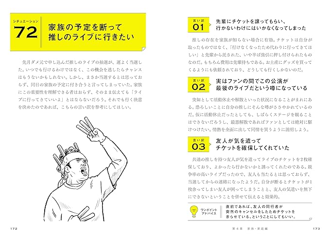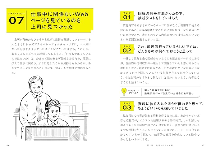 掲載シチュエーションは約80。著者が考案したものに加え、適宜アンケートも行い、「思わず言い訳をしたくなる瞬間」を集めました。