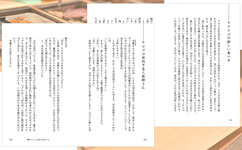 寿司屋になって50年のおかみさんが、先代から二代目へと引き継がれた名登利寿司を舞台に、寿司やつまみの変遷、人間模様、代替わりへの思いなどと共に、二代目の新しい味、引き継がれる変わらない味を綴るおいしくて、おもしろくて、ジンとくる「小さな名店」の悲喜こもごもを綴る寿司エッセイの新作です。