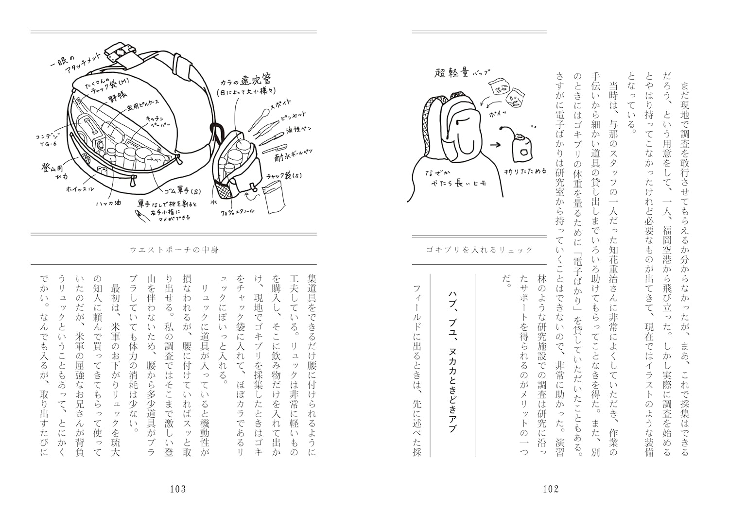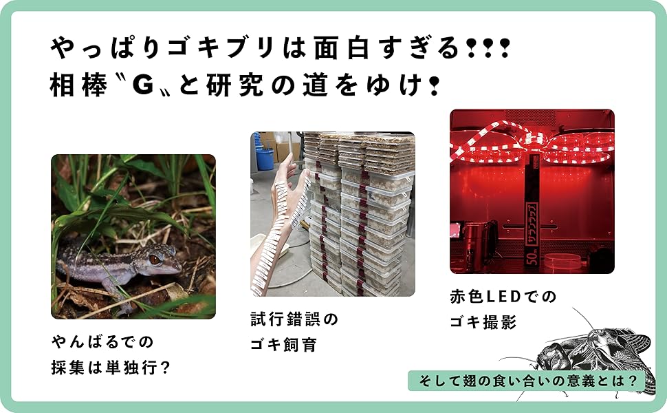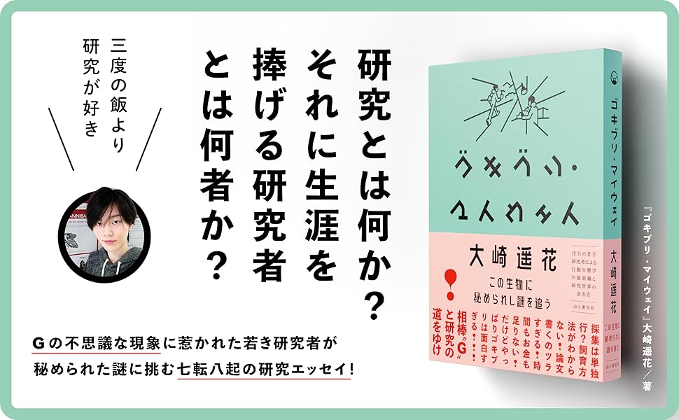 | ゴキブリ・マイウェイ この生物に秘められし謎を追う 大崎 遥花 (著) 採集は単独行? 飼育方法がわからない 相棒“G”と研究の道をゆけ! 注目の若手研究者による行動生態学の最前線と研究世界の歩き方 ブックデザイン/寄藤文平+垣内晴 |