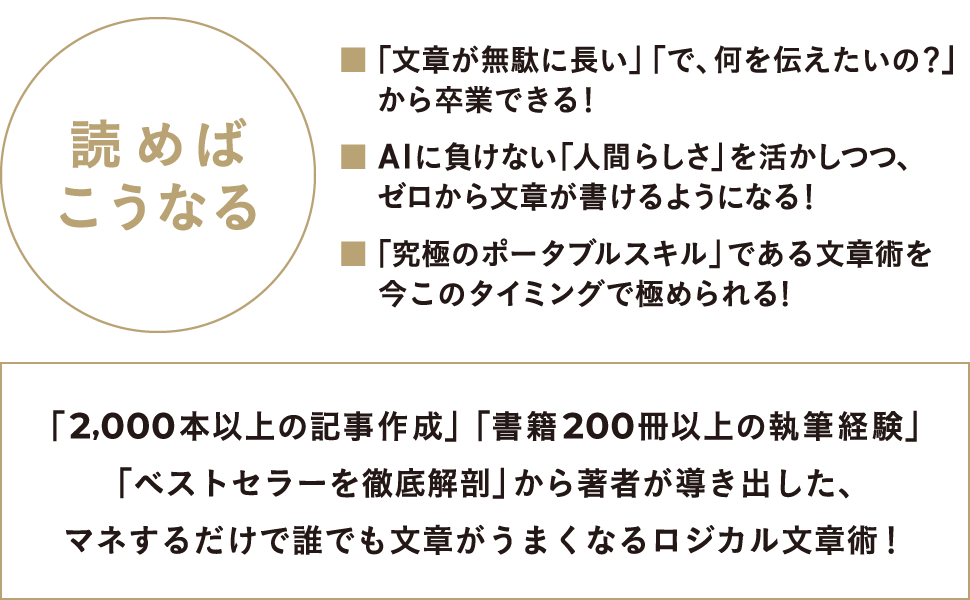 「2,000本以上の記事作成」「書籍200冊以上の執筆経験」「ベストセラー探究」から著者が導き出したロジカル文章術を、以下の5つのプロセスにわけて丁寧に解説します。