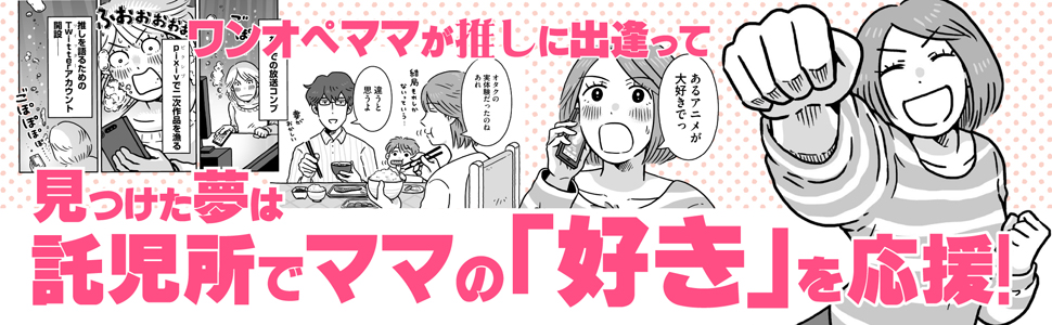 2人の子育てに疲弊している限界ワンオペママの四辻(よつつじ)。子どもは可愛いけれど、「自分の居場所がない」「生きている感じがしない」と常にストレスMAXな日々。そんな時出逢った推しジャンルで、二次創作に目覚め、毎日が輝くように。次は同人イベントに行きたい、しかし子どもを預ける場所がない……。そして、周りのオタクママ・パパたちも育児のために自分の好きを閉じ込めている現実を知って……そうだ自分で作ってしまおう!