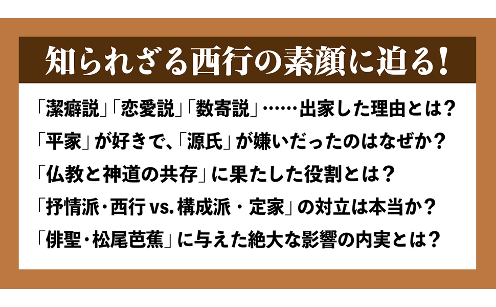 『新古今和歌集』に最多の94首が撰入された歌人としての西行はもちろん、「旅」「桜」「道の思想」「仏教と神道の共存」など文化史における西行の知られざる事績を分かりやすく紹介してくれる一冊です。