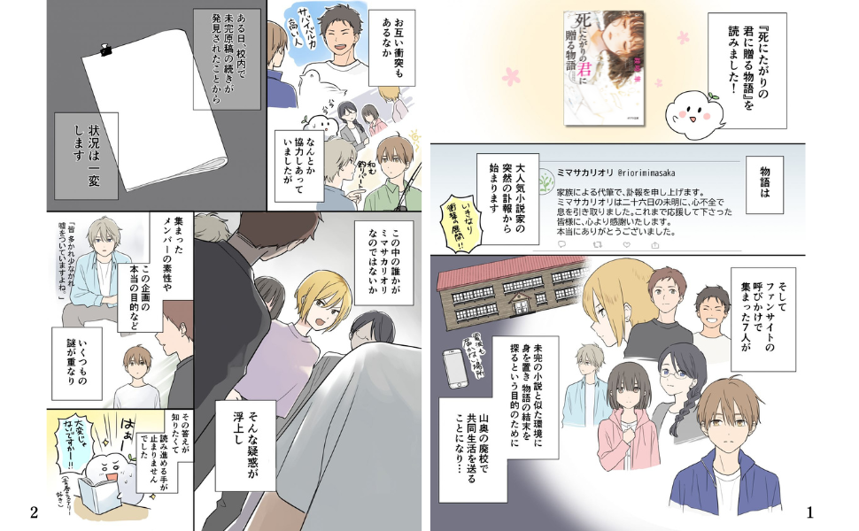 全国に熱狂的なファンを持つ、謎に包まれた小説家・ミマサカリオリ。だが、人気シリーズ完結を目前に訃報が発表された。同時に作品は厳しい批判にさらされ、さらにはミマサカに心酔していた17歳の少女・純恋が後追い自殺をしてしまう。純恋の自殺は未遂に終わるものの、彼女は「完結編が読めないなら生きていても意味がない」と語った。