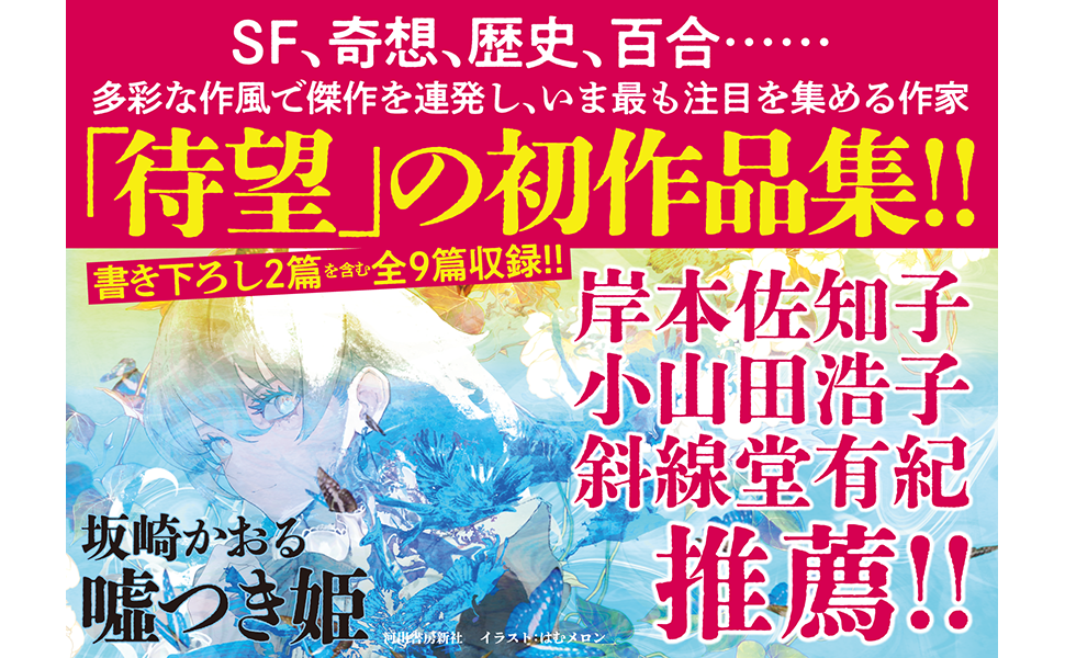 第4回百合文芸小説コンテスト大賞、第3回百合文芸小説コンテストSFマガジン賞、『ベストSF2022』、第1回かぐやSFコンテスト審査員特別賞、「さなコン」日本SF作家クラブ賞など受賞の超新鋭、坂崎かおるさん初の単行本『嘘つき姫』が河出書房新社より刊行されました。