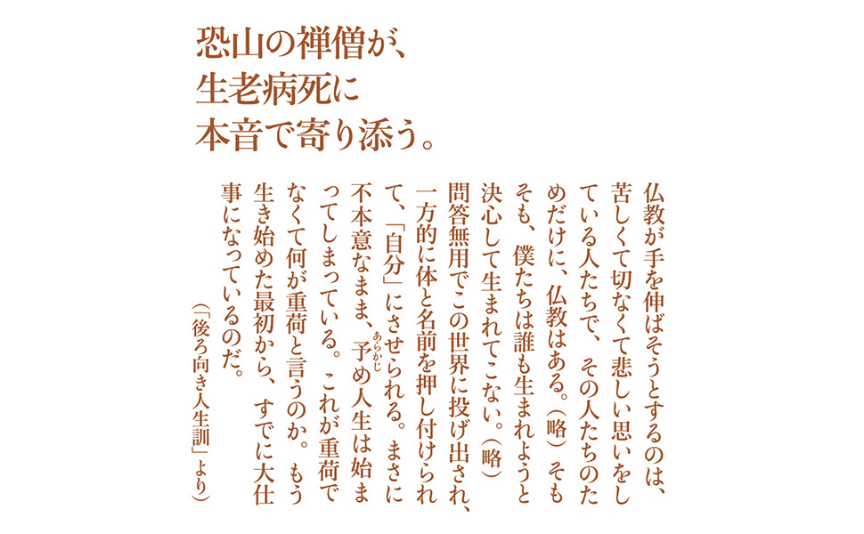 この世には、自分の力ではどうしようもないことがある。そのことに苦しみ切なく感じても、「生きているだけで大仕事」と思ってやり過ごせばいい――。「仕方なく、適当に」「万事を休息せよ」「死んだ後のことは放っておけ」など、心の重荷を軽くする後ろ向き人生訓。死者を求め辺境の霊場を訪れる人々、逸話だらけの修行時代、よい宗教とわるい宗教、親ガチャや苦の正体――恐山の禅僧が“生老病死”に本音で寄り添う。